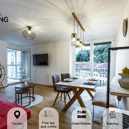 Offering a balcony and a seating area, Tamliving Ljubljana 2Br Center 3 Bridges Great View Kitchen Apartment comes with modern amenities like a flat-screen TV with satellite channels, enhancing your stay. The accommodation is also furnished with a sofa and a writing table. The property is equipped with a bathroom that features dryers, toiletries, and bath sheets. Moreover, there is a separate toilet and a shower as well.